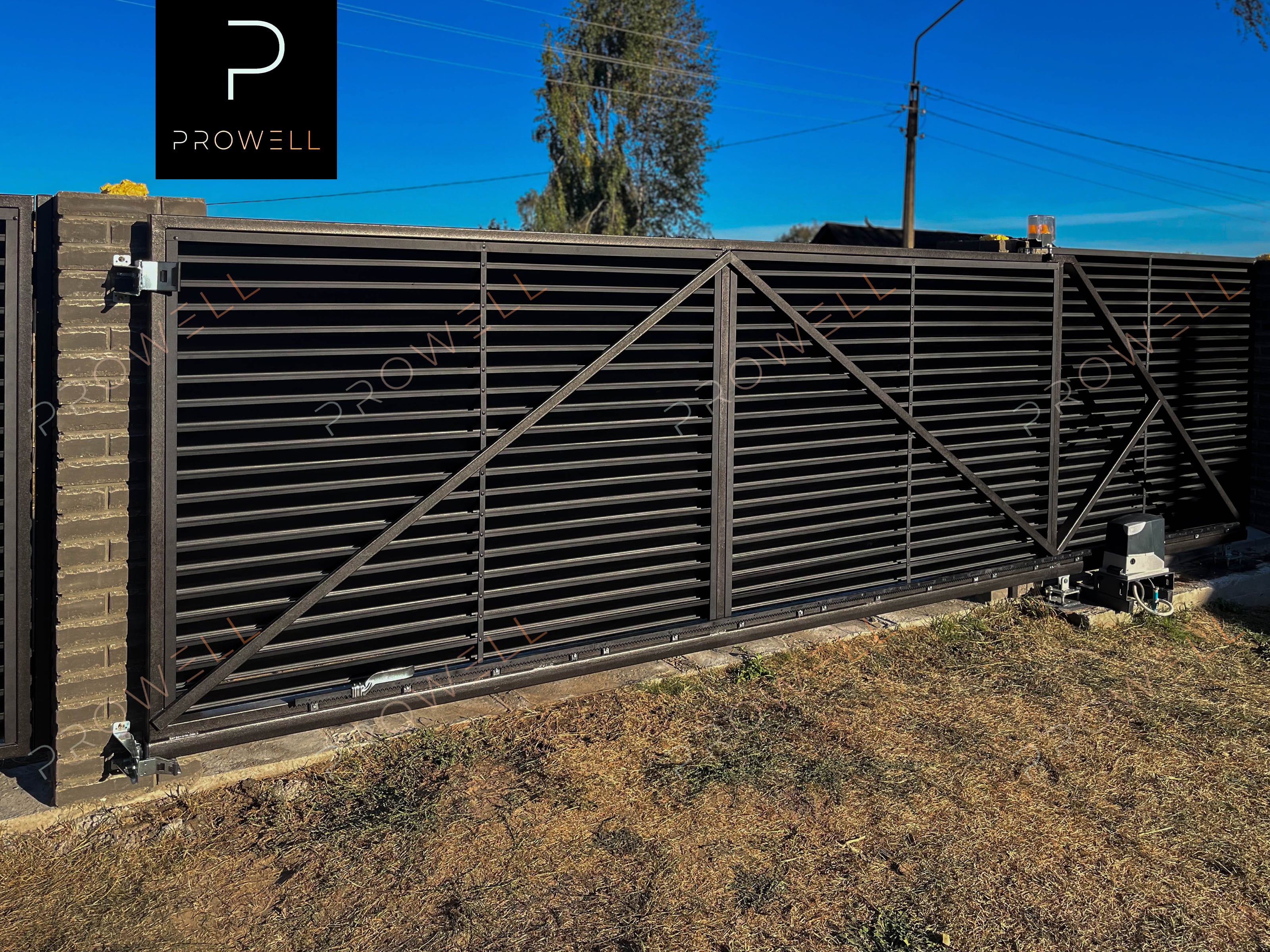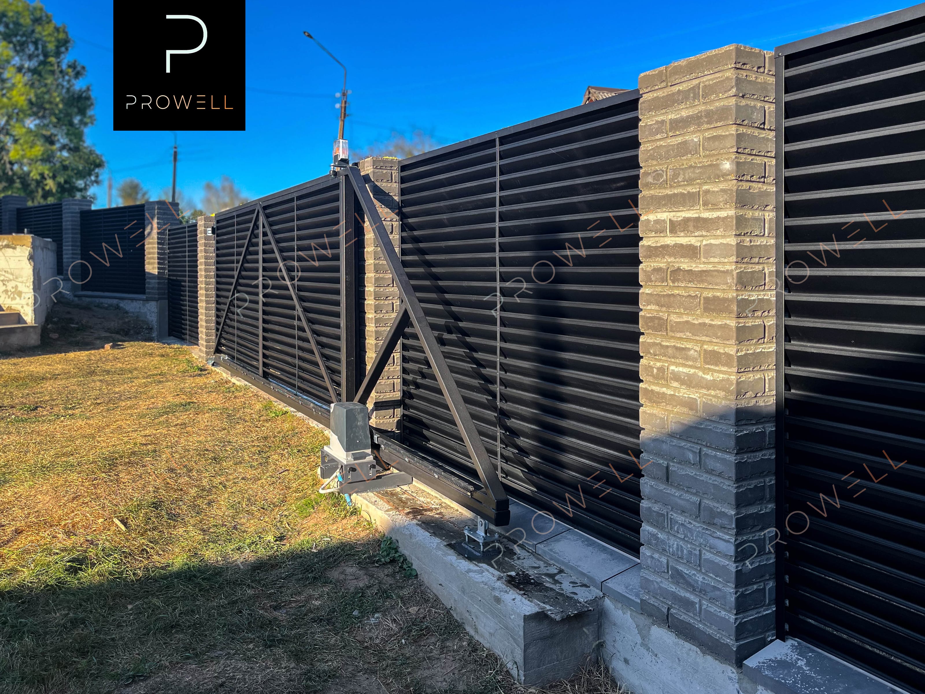 Используемые материалы: Калитка СТАЛЬНАЯ, Ворота откатные СТАЛЬНЫЕ, Автоматика для откатных ворот Nice RD 400KCE, Заборы-жалюзи Виола (Viola)